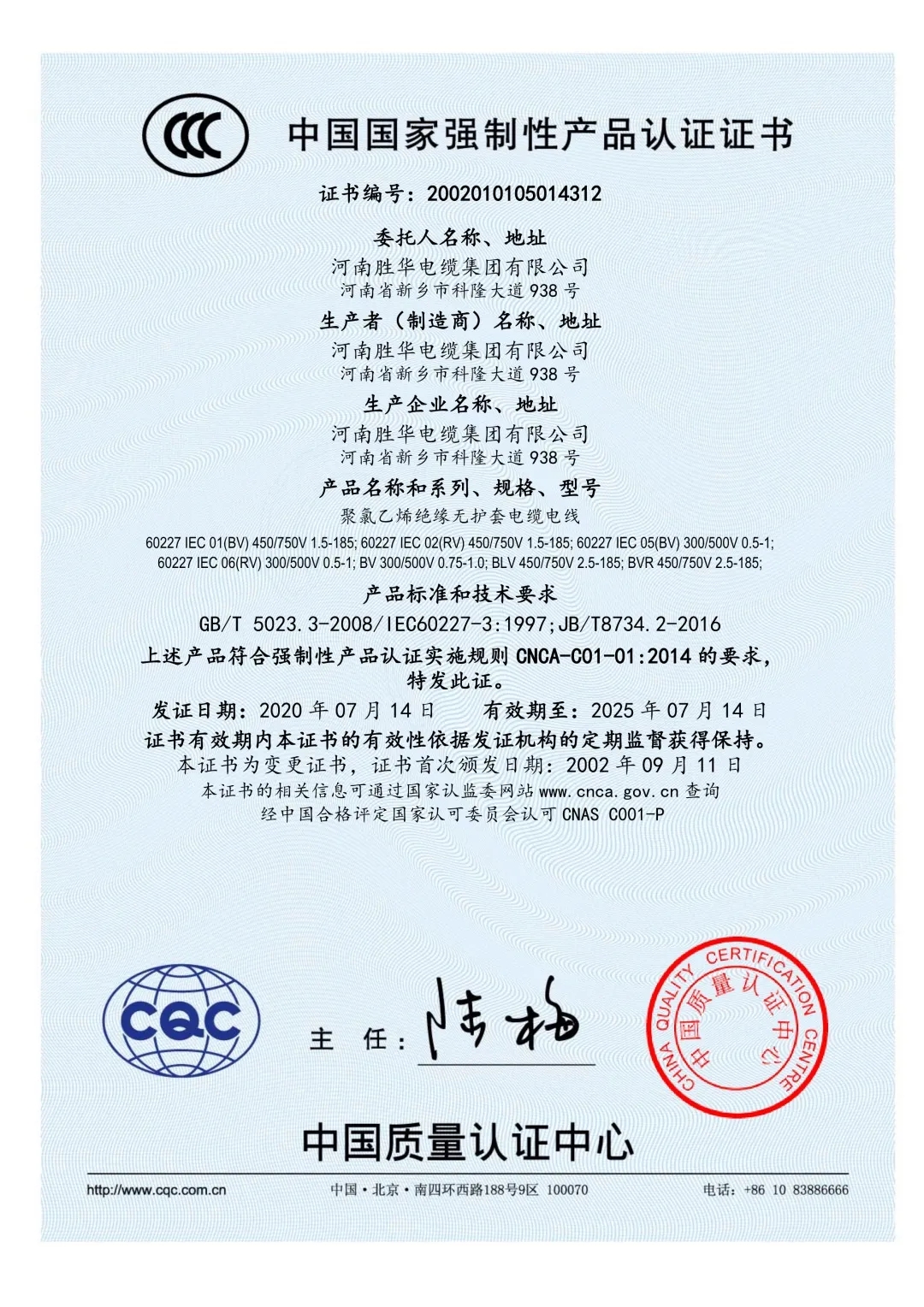 近期国家市场监督管理总局发布公告,为进一步加强产品质量安全监管工作,根据《中华人民共和国认证认可条例》有关规定,市场监管总局决定对对商用燃气燃烧器具、阻燃电线电缆、电子坐便器、电动自行车乘员头盔、可燃气体探测报警产品、水性内墙涂料、防爆灯具及控制装置实施CCC认证管理。 2025年7月1日起,列入CCC认证目录的阻燃电线电缆,应当经过CCC认证并标注CCC认证标志后,方可出厂、销售、进口或者在其他经营活动中使用。 产品描述与界定如下 CCC认证是中国政府为兑现加入世界贸易组织的承诺,于2001年12月3日对外发布了强制性产品认证制度。它是中国政府按照世贸组织有关协议和国际通行规则,为保护广大消费者人身和动植物生命安全,保护环境、保护国家安全,依照法律法规实施的一种产品合格评定制度。 实施强制性产品认证的产品,必须经过国家认监委指定认证机构的认证,并对产品实施强制性的检测和审核。没有获得指定认证机构的认证证书,没有按规定加施认证标志,一律不得出厂、销售、进口或者在其他经营活动中使用。 3C标志并不是质量标志,它是一种最基础的安全认证。相信随着CCC目录中电线电缆产品型号的增加,定会促进电线电缆生产厂家严格把控产品质量,为广大消费者交付安全放心的产品。 胜华电缆集团始建于1954年,中国机械制造500强,是一家非常有实力的电线电缆厂家,产品涵盖电线电缆型号几十万种,包括但不限于KVVP屏蔽控制电缆,ZR-YJV22铠装电力电缆,ZR-BVR,RVS,RVV聚氯乙烯绝缘护套家用布电线,YJLHV铝合金电缆,BTTZ矿用电缆,架空电缆,防火特种电缆等产品。所有产品都符合国家标准生产,质量有保障,优质电缆,选胜华电缆。产品大类 产品种类及代码 对产品种类的描述 产品适用范围 对产品适用范围的描述或列举 说明 电线电缆 额定电压450/750V及以下橡皮绝缘、聚氯乙烯绝缘阻燃电线电缆(0104、0105) 交流额定电压不超过450/750V的动力装置用阻燃电缆。 额定电压450/750V及以下橡皮绝缘阻燃电线电缆(0104) 产品标准中列明型号规格、具有阻燃特性的橡皮绝缘电线电缆。 产品标准: GB/T5013.3~.8 JB/T8735.2~.3 燃烧特性标准: GB/T19666 GB31247 额定电压450/750V及以下聚氯乙烯绝缘阻燃电线电缆(0105) 产品标准中列明型号规格、具有阻燃特性的聚氯乙烯绝缘电线电缆。 产品标准: GB/T5023.3~.7 JB/T8734.2~.6 燃烧特性标准: GB/T19666 GB31247